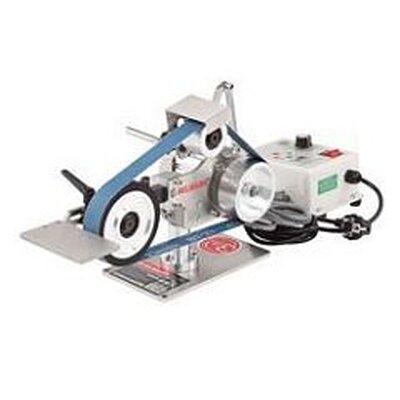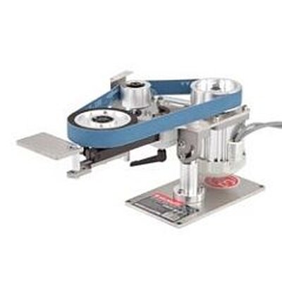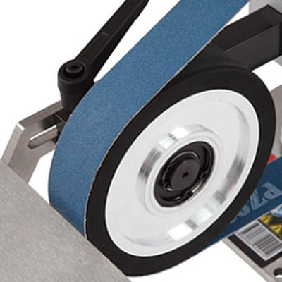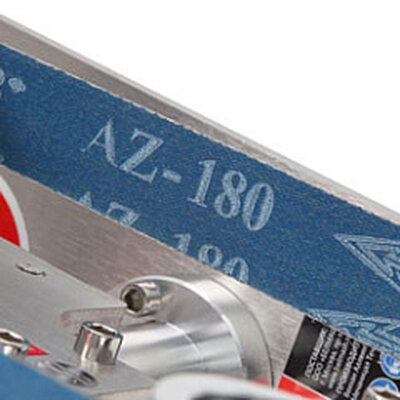 - Используются шлифовальные ленты размером 762×25 мм с циркониевым электрокорундом. В комплект входят три ленты с зернистостью P100, P180 и P240 для грубой, промежуточной и финишной обработки. Поворотная консоль с роликами обеспечивает регулировку угла наклона от −15° до +20°, а также возможность работы в вертикальном и горизонтальном положении с наклоном узла до 90°. Контактный ролик диаметром 100 мм с резиновым покрытием обеспечивает плавный ход и стабильное натяжение ленты.
